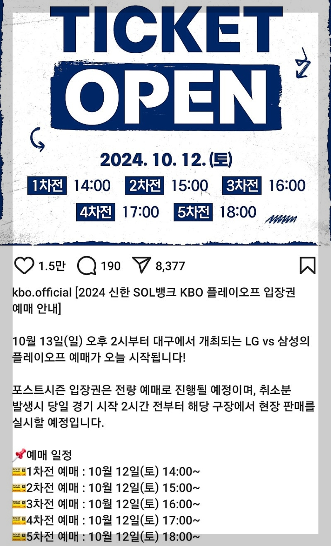 포스트시즌 티켓은 일반 정규 시즌 경기와는 달리 예매 경쟁이 매우 치열합니다. 직관을 원하신다면 티켓 오픈 정보를 미리 확인하고 준비해야 합니다. 포스트시즌 예매는 보통 단독으로 NOL인터파크를 통해 진행됩니다. (KBO 공식 채널 확인 필수)