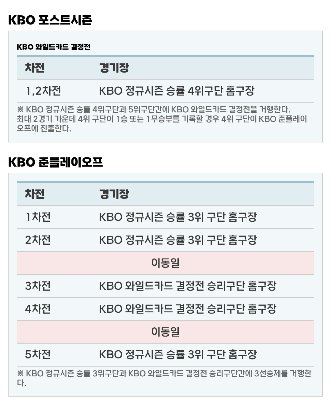 - 준플레이오프 (준PO): WC 승리 팀 vs 3위 (5전 3선승제)