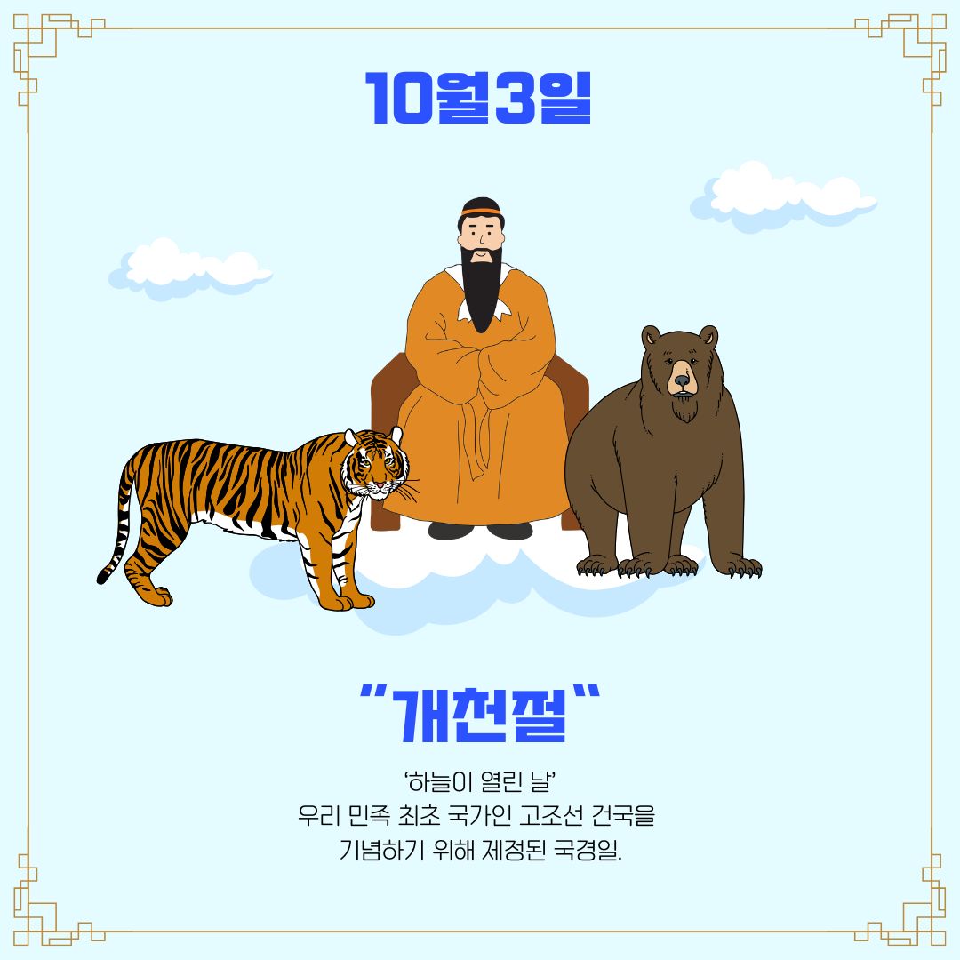 개천절은 우리 민족이 처음 나라를 세운 날을 기념하는 뜻깊은 국경일입니다. 개천절의 뜻을 되새기고, 공휴일로서 가족과 함께 의미 있는 시간을 보내며, 개천절 노래와 다양한 행사를 통해 우리 역사의 소중함을 느껴보는 하루가 되길 바랍니다. 10월 3일, 태극기와 함께 개천절의 의미를 다시 한번 마음에 새겨보세요.
