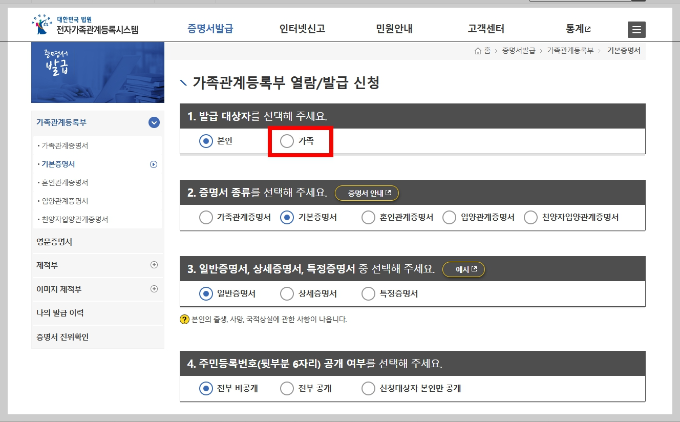 2. 상단 메뉴에서 '증명서발급' - '가족관계등록부' - '기본증명서 (또는 가족관계증명서)' 클릭