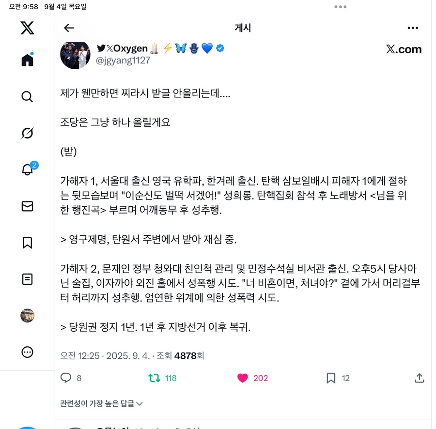 - 당의 조치: 당은 성비위 신고 접수 후 윤리위원회에 회부했으며, 피해자와 가해자를 분리하는 초동 조치를 취했다고 밝혔습니다. 또한 외부 전문기관에 사실관계 조사를 의뢰했고, 조사 결과를 토대로 징계 절차를 진행했습니다. 조국혁신당은 8월에 윤리위원회와 인사위원회를 통해 가해자에 대한 징계를 완료했다고 발표했습니다.