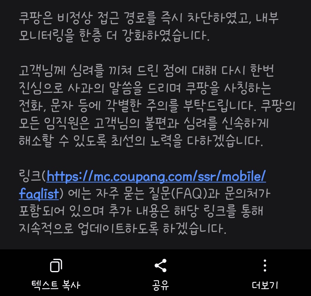 쿠팡측에서 피해방지 조치를 취했으므로 고객님들께서는 따로 할 일이 없다고 말은 합니다만 그 말을 어떻게 믿겠습니까?
