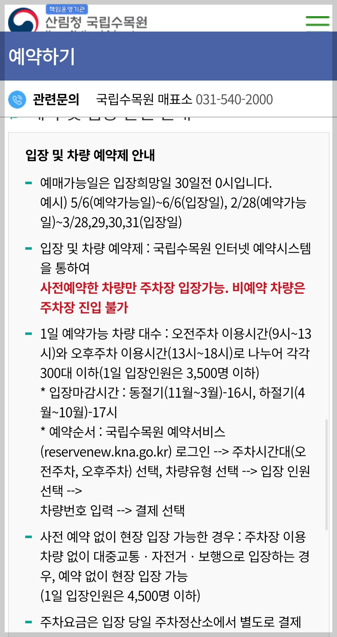 수목원 이용은 월요일을 제외하고 화요일~일요일까지 가능하고 예약은 이용 날짜 30일 전 자정(밤 12시)부터 가능합니다.