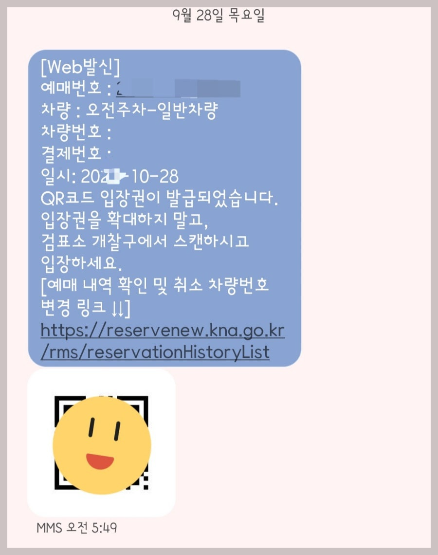 문자메시지로 예약학인 메시지와 큐알코드를 받았어요. 입장할 때 큐알을 찍고 들어가면 된답니다.